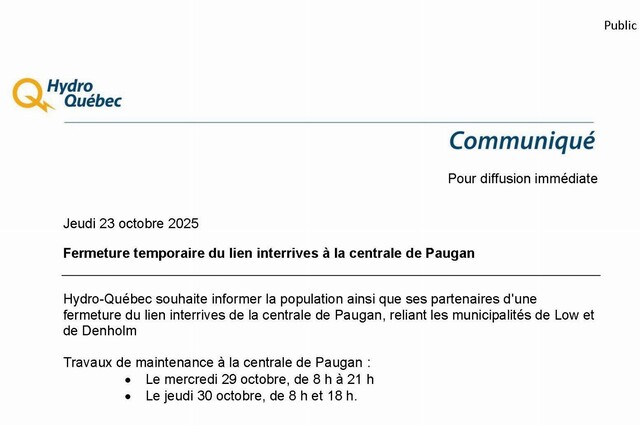 Fermeture temporaire du lien interrives à la centrale de Paugan Hydro-Québec souhaite informer la population ainsi que ses partenaires d'une fermeture du lien interrives de la centrale de Paugan, reliant les municipalités de Low et de Denholm Travaux de maintenance à la centrale de Paugan : •Le mercredi 29 octobre, de 8 h à 21 h •Le jeudi 30 octobre, de 8 h et 18 h.