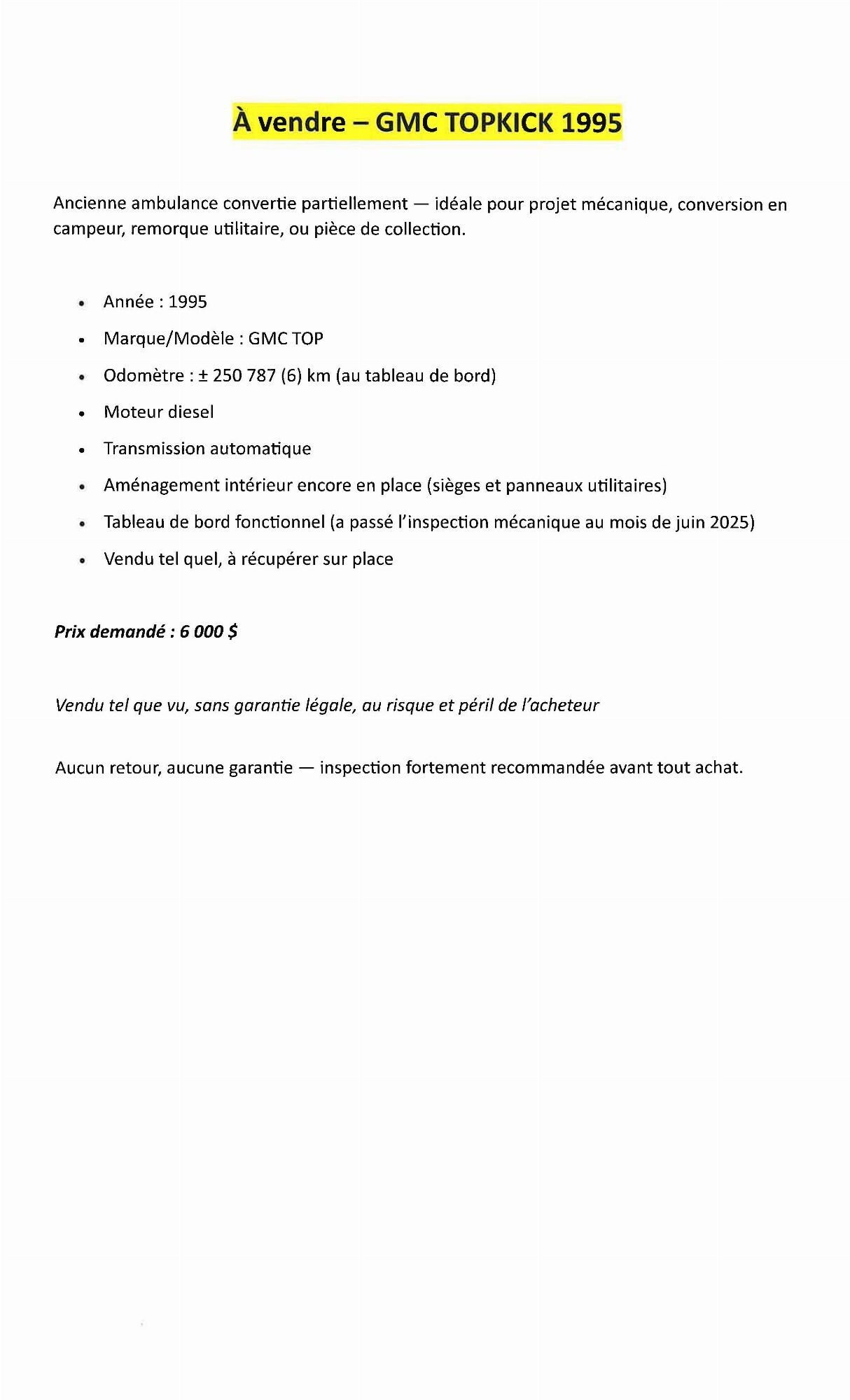 • Tableau de bord fonctionnel (a passé l'inspection mécanique au mois de juin 2025)